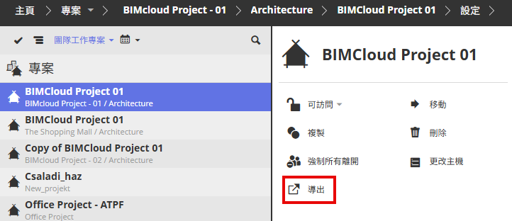 使用此功能可以將團隊工作專案或圖庫下載到您的計算機上,檔案格式為.BIMProject或.BIMLibrary)。