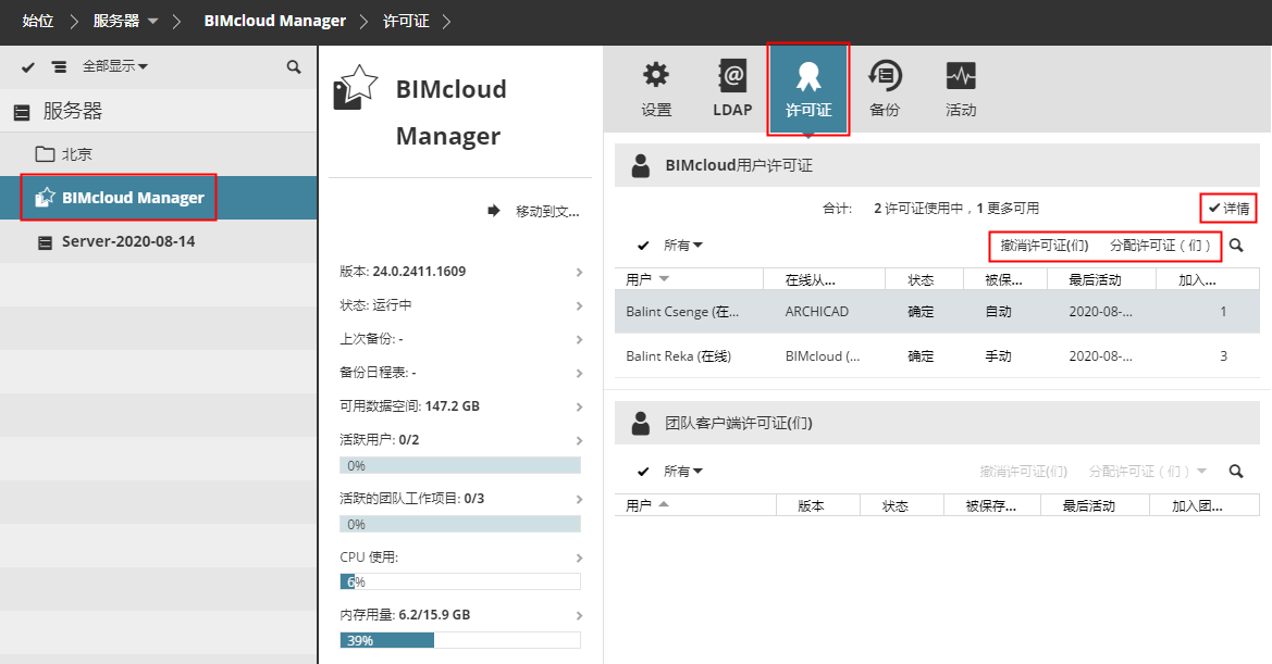 點擊詳細訊息按鈕,獲得 BIMcloud 所有許可證的概述訊息: