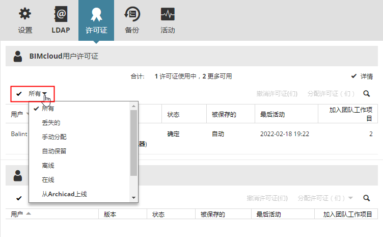 這裡概述了當前使用、可用和丟失的BIMcloud用戶許可證。