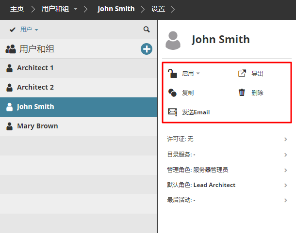 管理 BIMcloud 用戶 組織和管理用戶與組 在 BIMcloud Manager 的 "用戶和組 "頁面,您可以查看和過濾用戶列表並建立用戶組。其他可用功能取決於您在“導航器”(用戶或用戶組)中選擇的內容而異。 BIMcloud 的用戶列表 對用戶列表進行篩選與排序 建立一個新用戶 添加可以使用您 BIMcloud 許可池中的許可的本地用戶 建立用戶組 在 BIMcloud 上建立用戶組 用戶設定與許可證 許可證、個人設定、密碼 用戶訊息 基於加密鎖許可證的BIMcloud SaaS 複製用戶或組 複製一個現有的用戶或組 刪除用戶或組 基於加密鎖許可證的BIMcloud SaaS 啟用或禁用一個用戶 被禁用的用戶暫時失去對 BIMcloud 的訪問權限 強制用戶從團隊工作專案中退出 從一個或多個團隊工作專案中踢除用戶 發送Email 向選定的 BIMcloud 用戶發送電子郵件