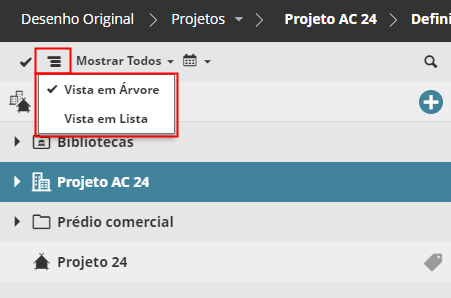 Nas páginas Projetos e Servidores: Visualizar itens em uma exibição em Árvore hierárquica ou em uma lista plana.