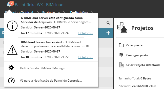O cabeçalho contém notificações sobre o BIMcloud e atalhos para configurações do BIMcloud.