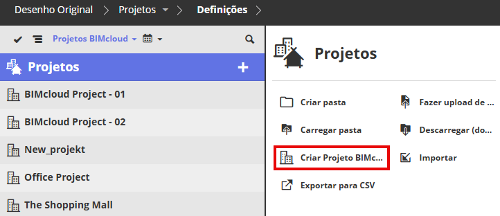 A partir da raiz dos Projetos ou em qualquer pasta na árvore dos Projetos: clique em Criar Projeto BIMcloud.