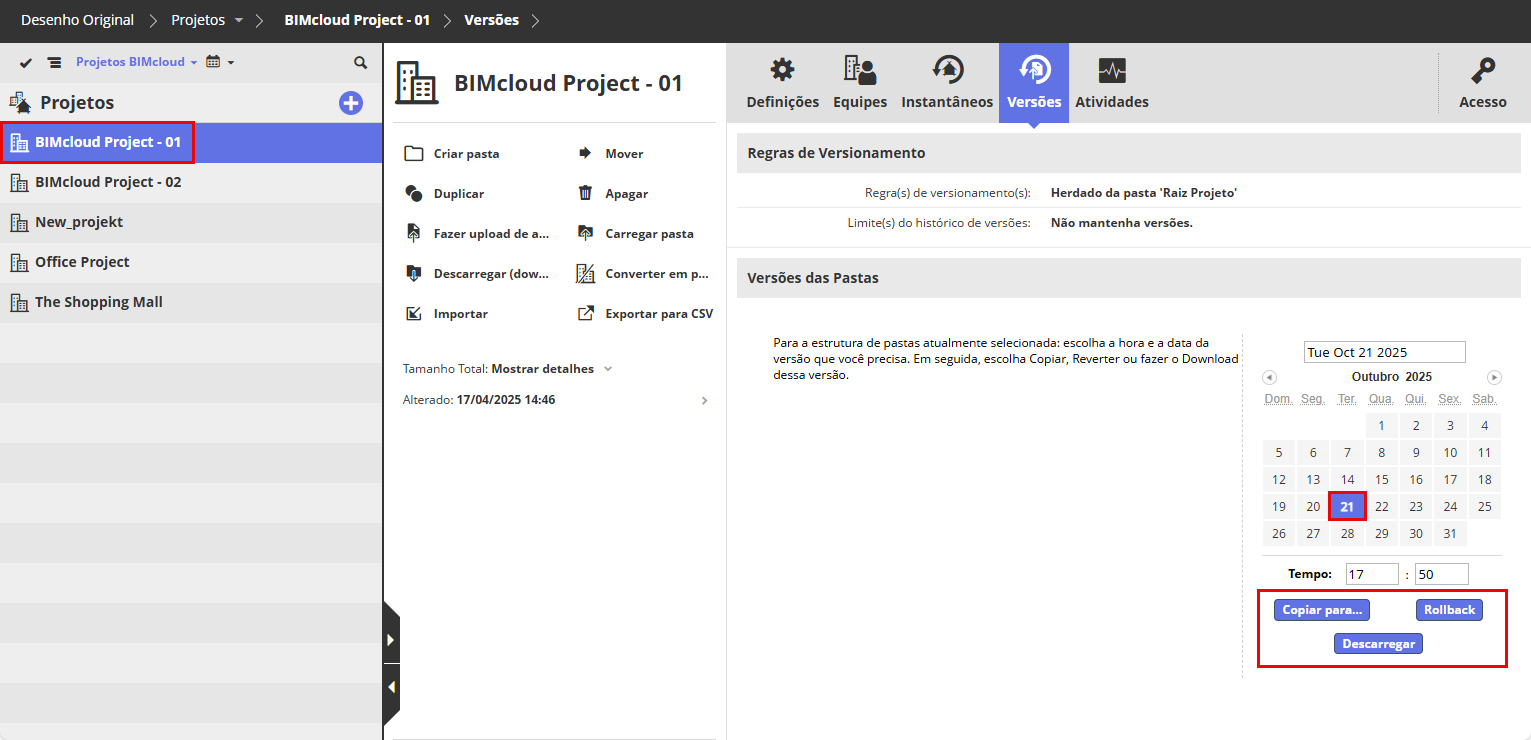 Nota: A pasta copiada conterá apenas a última versão de cada arquivo carregado.Reverter: Os arquivos nesta pasta serão revertidos para a data selecionada.