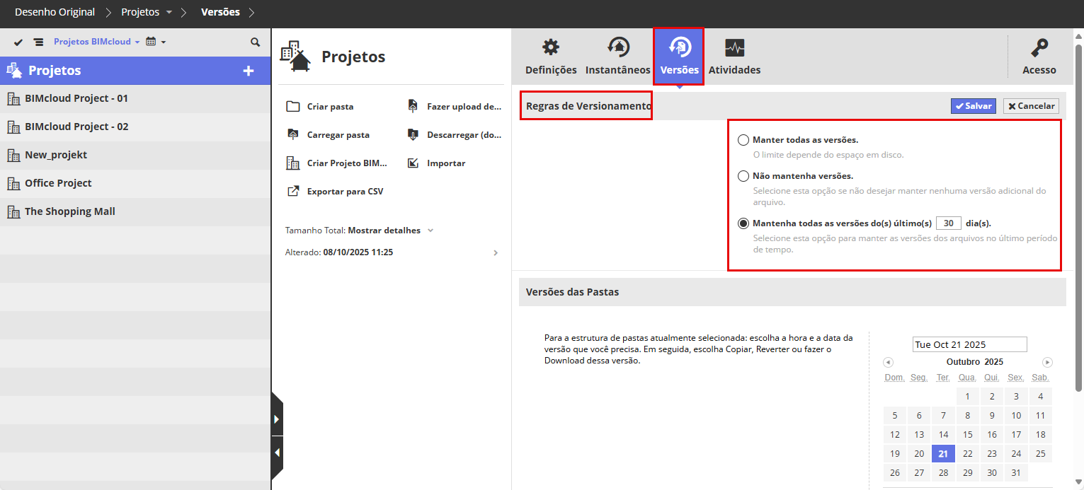 Manter todas as versões: Este é o padrão: todas as versões anteriores são mantidas indefinidamente, desde que o espaço permita.
