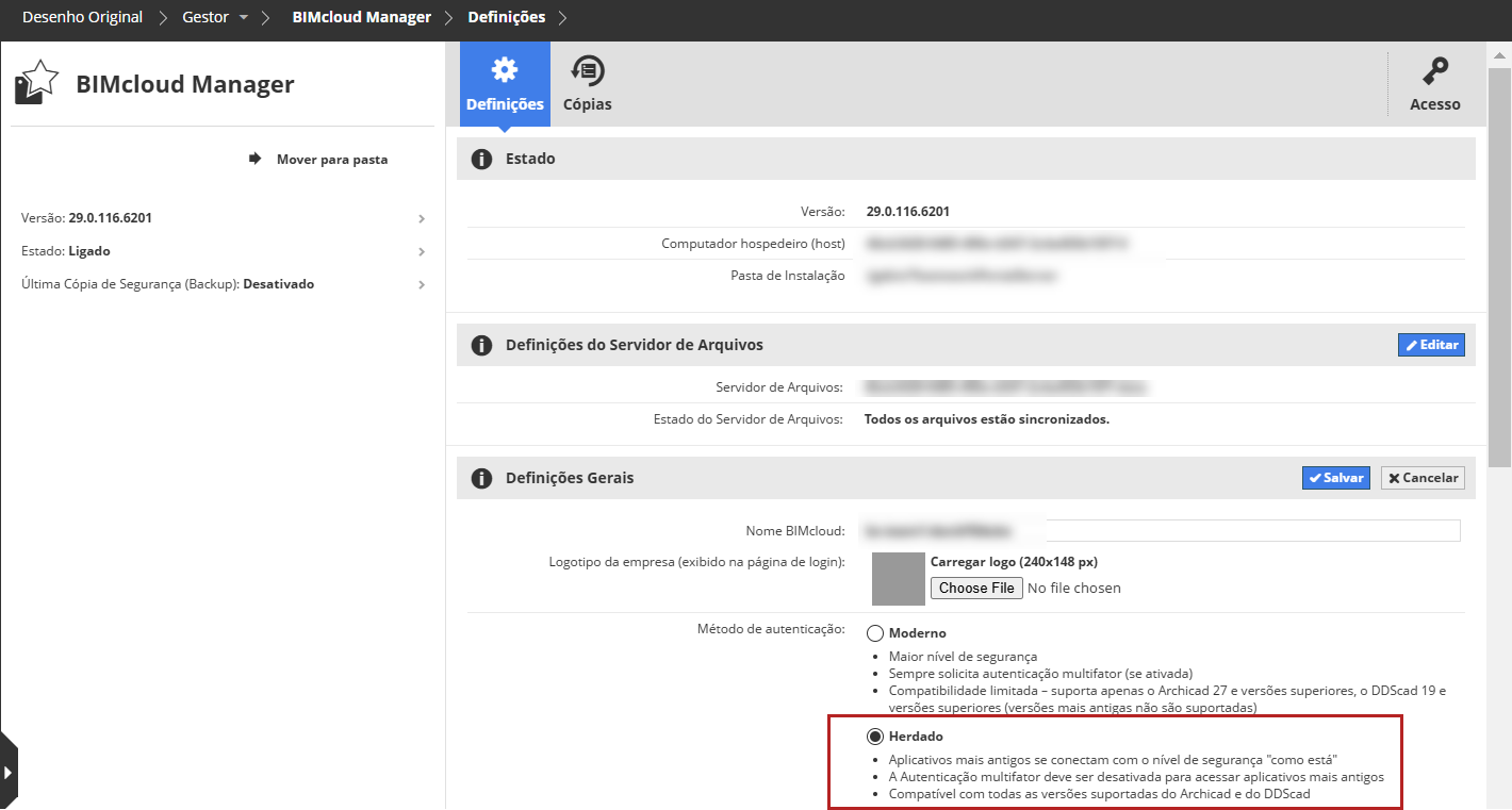 Se você também quiser trabalhar com projetos de versões mais antigas, ative a “Autenticação Herança” nas definições do BIMcloud Manager.