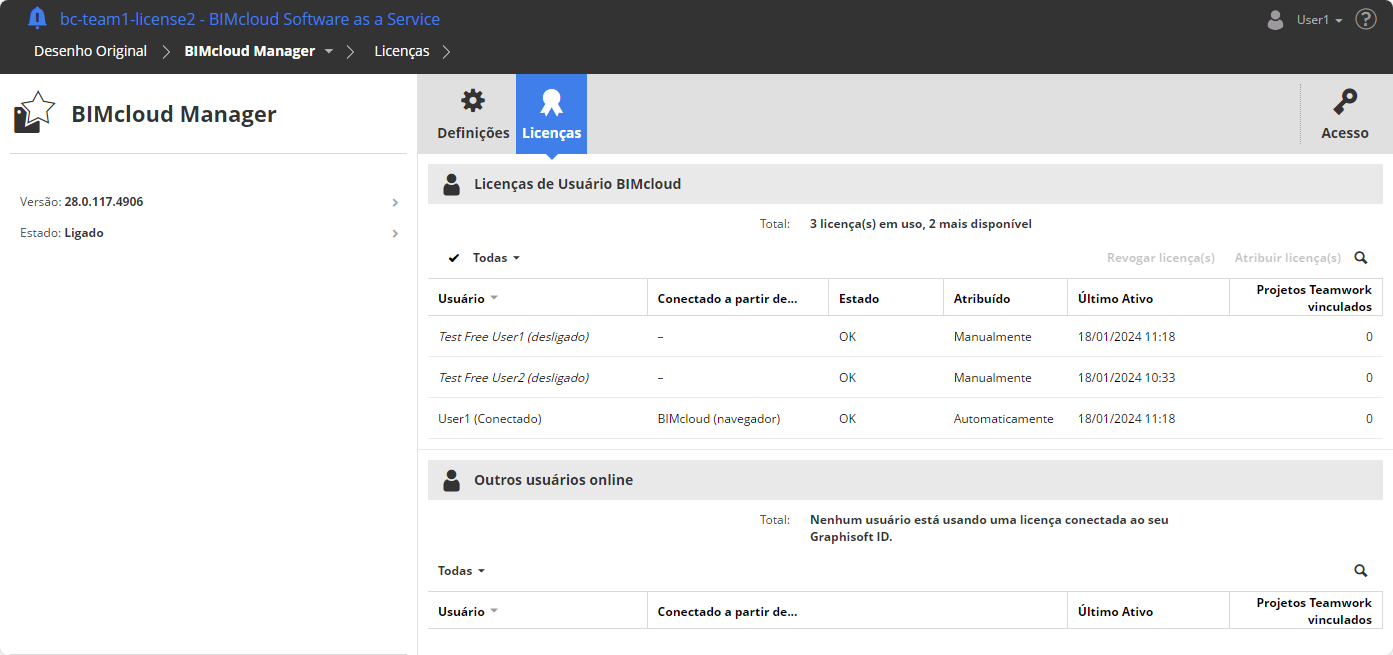Se você tiver uma configuração tradicional de licenciamento SaaS do BIMcloud (em vez de licenças na nuvem), gerencie as licenças no BIMcloud Manager, conforme descrito abaixo.
