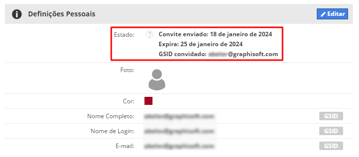 Visualize o status do convite e a data de expiração nas Definições Pessoais. O convite expira automaticamente após 7 dias.