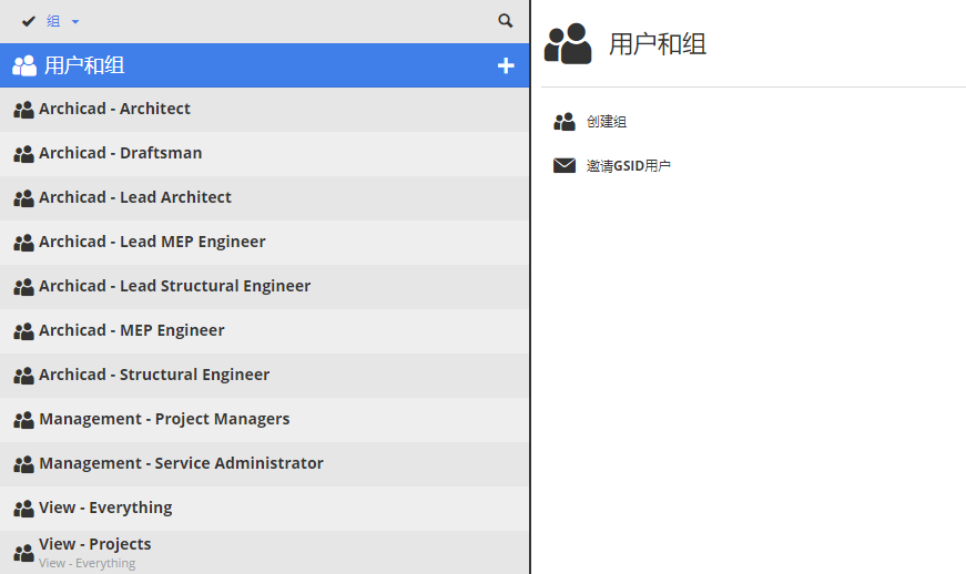 BIMcloud Saas 有默认的用户组,包含预设置角色及权限。推荐将用户分配至默认用户组。这些组又与角色和相关的权限集相关联。