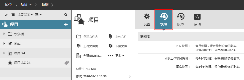 在“快照”面板上设置自动快照计划,可以是在“项目”根目录,或任何文件夹,或单个团队工作项目。