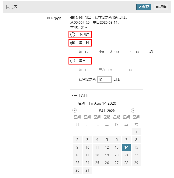 • 保留最后一个:输入要保留的快照数。(您必须保持至少一个拷贝。)进行每一次自动快照时,最早存储的快照将被删除。