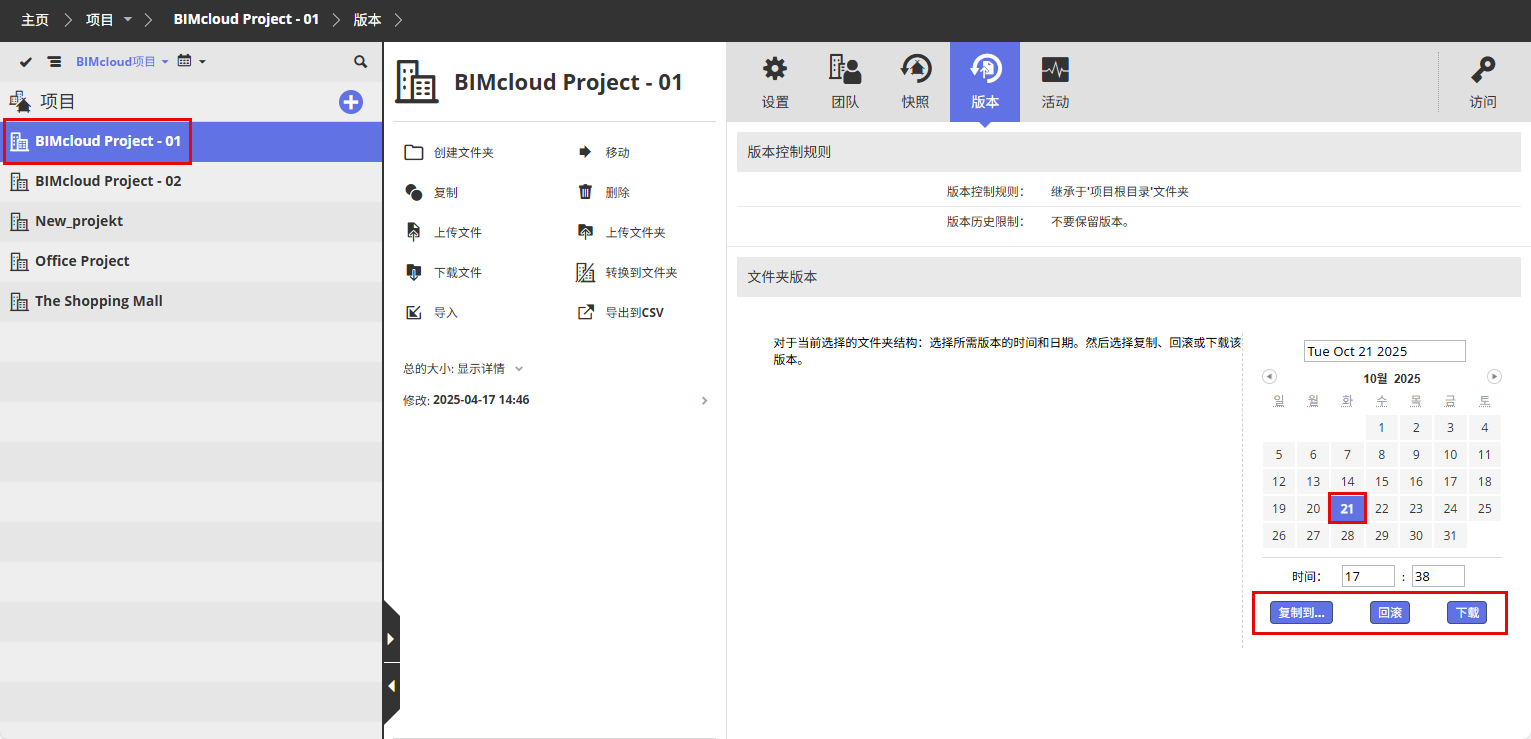 注: 复制文件夹将只包含每个上传文件的 最新版本回退:这个文件夹中的文件将回滚到选定的日期。