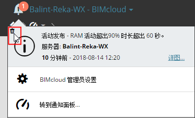 通知下拉表和当前通知的完整列表可在BIMcloud Manager每一页的最左上角进行查看。