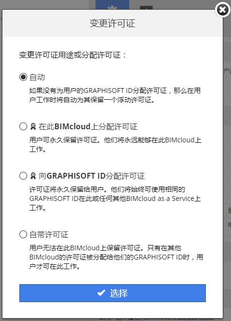 注: 此命令仅适用于通过 GSID 连接的 BIMcloud 用户。选择所需的许可证类型,然后单击“选择”。