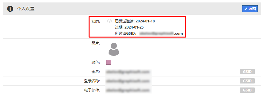 邀请已发送,但已过期。电子邮件中的接受链接失效。您可以单击“连接到 GSID”按钮并再次发送邀请。