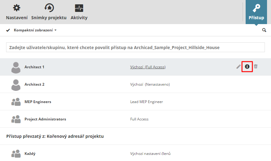 Vyberte položku ve BIMcloud Manageru. Na panelu Přístup jsou zobrazení uživatelé a skupiny, které mají k položce přístup.