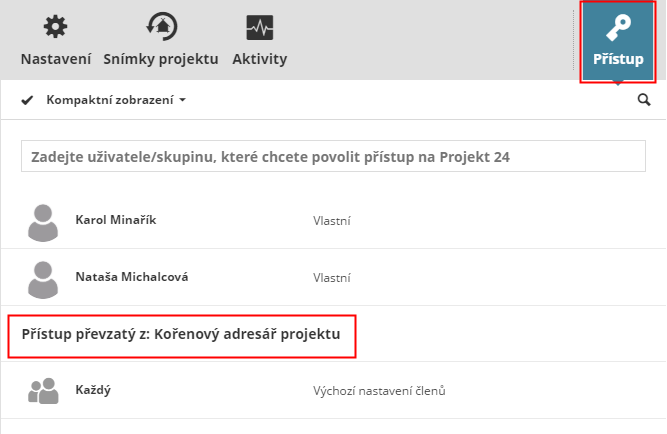 - V horní části seznamu se zobrazují uživatelé/skupiny, pokud jim byl udělen přístup k dané položce (správce přidal jejich jméno ručně - viz Udělení přístupu)