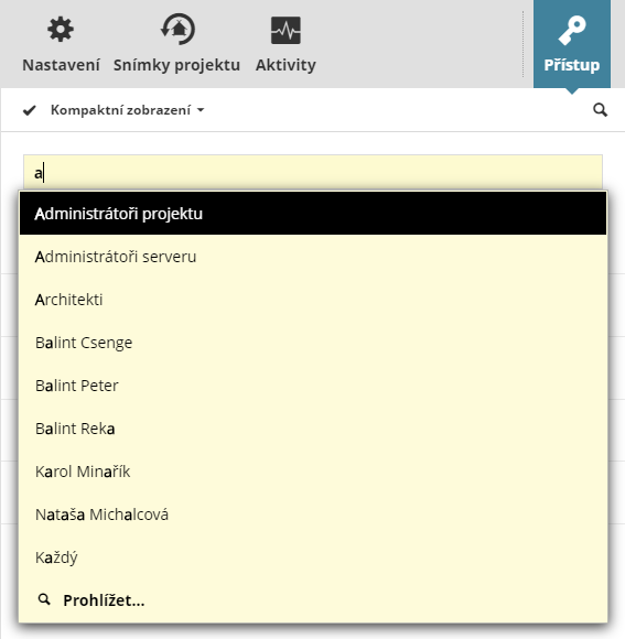 Otevřete panel Přístup a začněte psát jméno uživatele/skupiny, která bude mít přístup, nebo klikněte na Hledat. Pokud chcete přístup zajistit všem, použijte speciální skupinu Všichni.