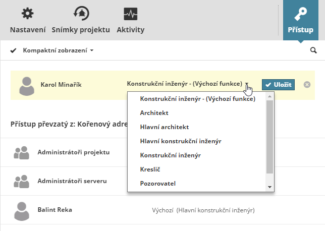 - Vyberte funkci vybraného uživatele nebo skupiny – tím určíte, jakou funkci bude pro označenou položku mít. (Každá funkce je sada oprávnění. Nastavit a upravit funkce můžete na stránce Funkce.) Můžete:
