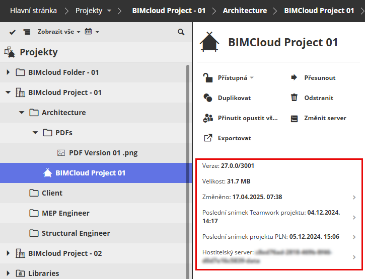 Když je to možné, můžete kliknout na položku, jejíž příslušnou stránku chcete otevřít v BIMcloud Manageru (klikněte na příklad na hostitelský server - otevře se stránka Servery.)