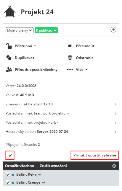 Zaškrtněte pole uživatelů, které chcete přinutit opustit projekt: Tlačítko “Přinutit opustit vybrané” je aktivní.