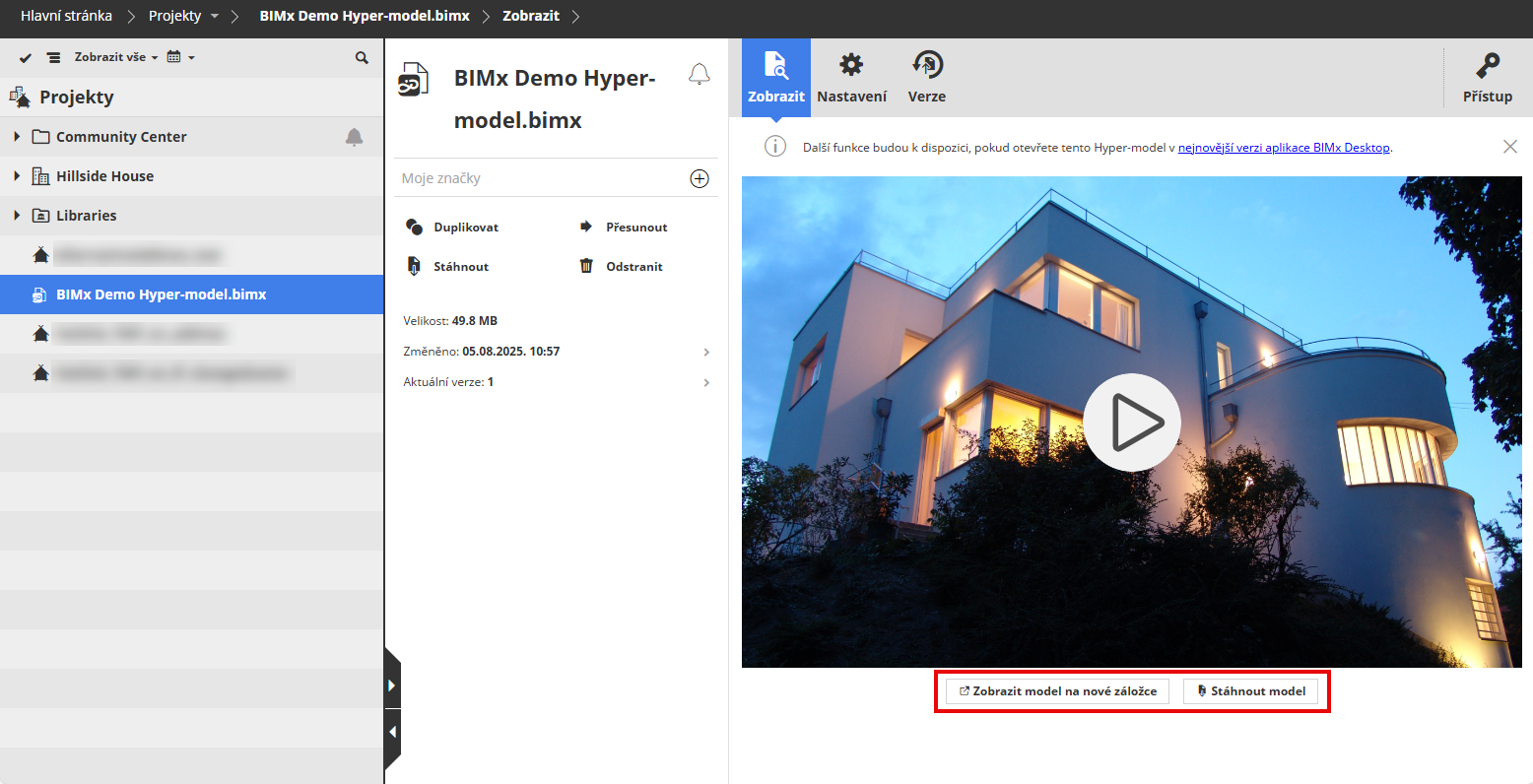 Poznámka: Může být k dispozici aktualizovaná verze aplikace BIMx Desktop Viewer, která zatím není integrovaná do BIMcloudu. Chcete-li využít další funkce, zkuste tento Hyper-model otevřít v nejnovější verzi aplikace BIMx Desktop Viewer.