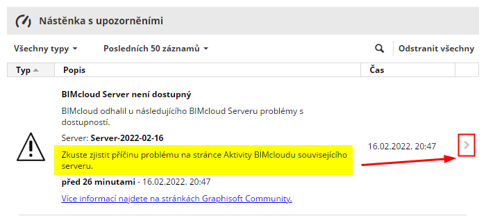 U každé položky můžete kliknout na šipku, která automaticky otevře stránku BIMcloud Manageru (nebo jiné umístění), kde můžete problém ověřit a případně vyřešit.