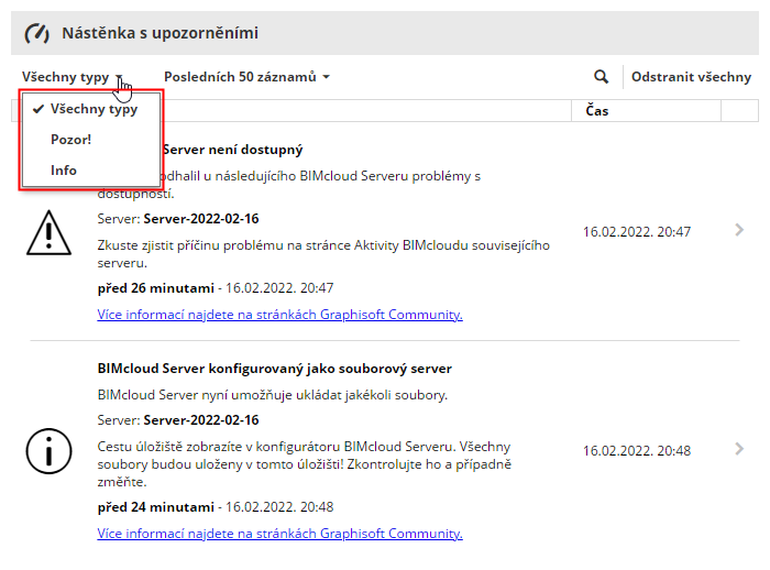 na notifikační nástěnce (samostatná stránka BIMcloud Manageru)