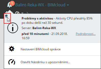 Notifikace budou zobrazeny také ve formě bublin v odpovídajících částech BIMcloud Manageru: