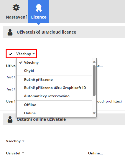 Seznam uživatelů, kteří aktuálně používají licence z vašeho úložiště. Seznam můžete filtrovat podle vybraných typů licencí: