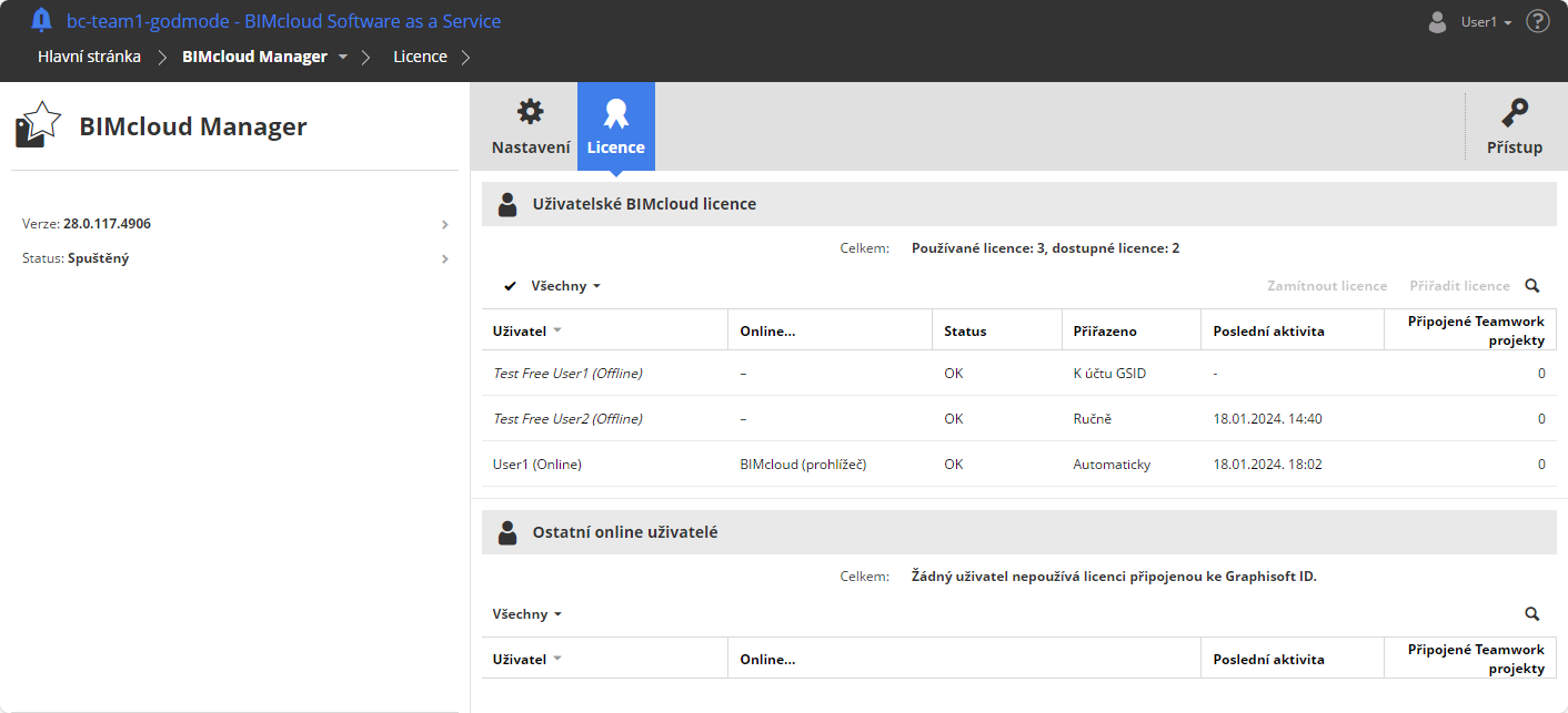 Viz také článek na stránkách Graphisoft Community: Přidělování licencí na platformě BIMcloudu Software as a Service