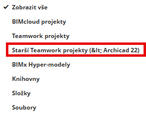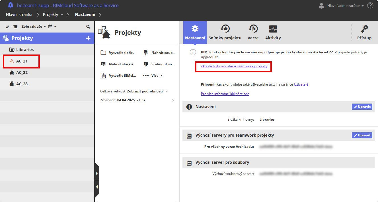 Ve BIMcloud Manageru zkontrolujte stránku Projekty: všechny starší Teamwork projekty jsou označené červenou ikonou.