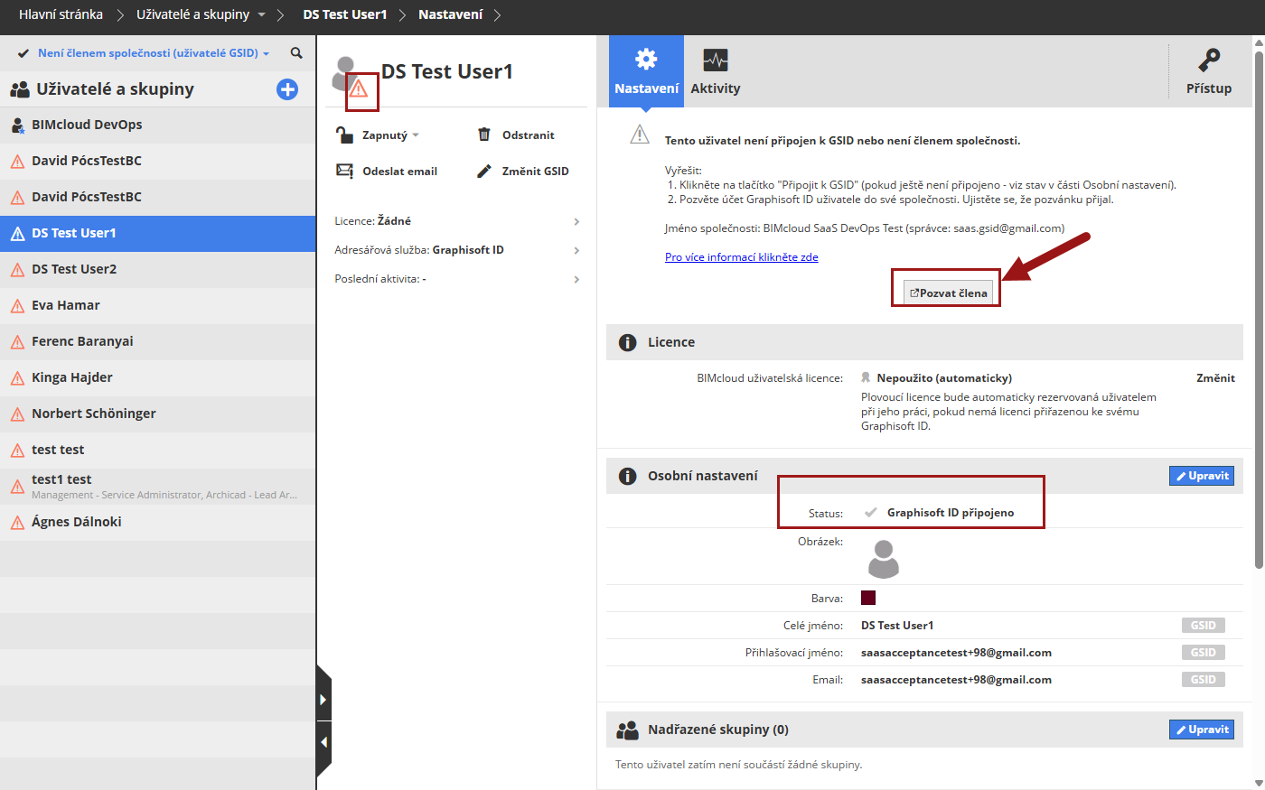 Všichni vaši BIMcloud uživatelé musí být pozváni jako členové vašeho firemního účtu. Uživatelé, kteří ještě nejsou členy: kliknutím na "Pozvat člena" otevřete svůj firemní účet Graphisoft a pošlete pozvánky.