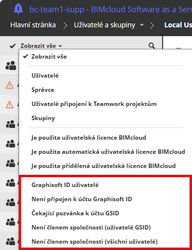 Chcete-li se na to připravit, přejděte do BIMcloud Manageru a otevřete stránku Uživatelé: uživatelé, které ještě musíte převést, jsou označeni červenou ikonou.