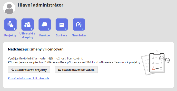 Uživatele a cloudové licence budete spravovat ve svém firemním účtu (místo lokálního rozhraní BIMcloudu)