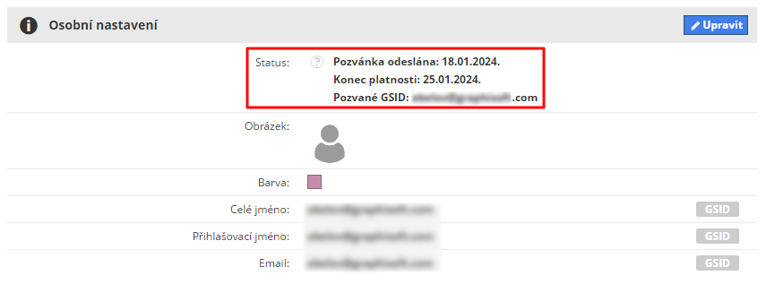 Zaslané pozvánce skončila platnost. Odkaz v zaslaném emailu již NENÍ platný. Můžete kliknout na “Připojit k účtu GSID” a pozvánku zaslat znovu.