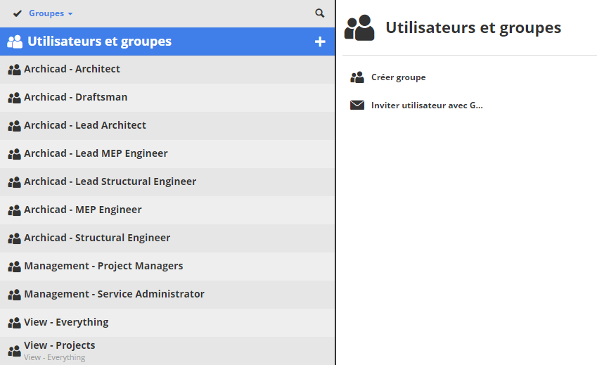 Les groupes “Gestion” fournissent des permissions pour BIMcloud, pour gérer des projets, des bibliothèques et des utilisateurs.