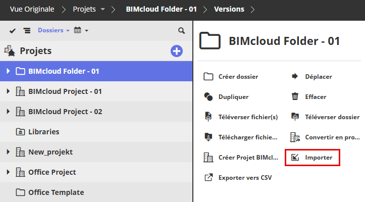 Vous pouvez importer un fichier projet partagé (extension .BIMProject) ou un fichier bibliothèque (.BIMLibrary) vers un dossier sélectionné sur BIMcloud.