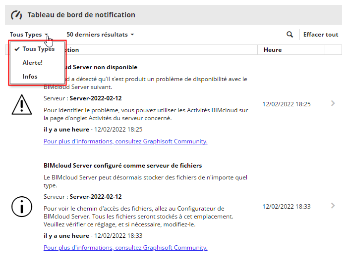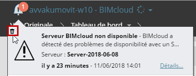 Le Tableau de bord de notification liste les notifications actuellement actives pour le BIMcloud. Pour accéder au Tableau de bord, procédez de l'une de ces manières :