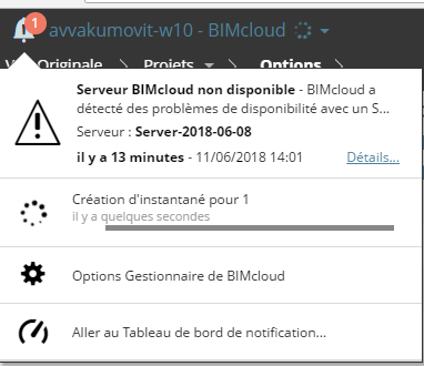 Vous pouvez également voir les Notifications dans des contrôles déroulants dans les parties appropriées du BIMcloud Manager :
