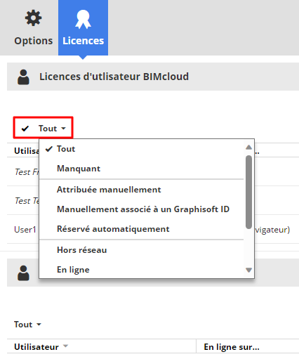 Listes des utilisateurs qui utilisent actuellement des licences de votre entreprise. Si nécessaire, utilisez le filtre pour n'afficher que certains types de licence :