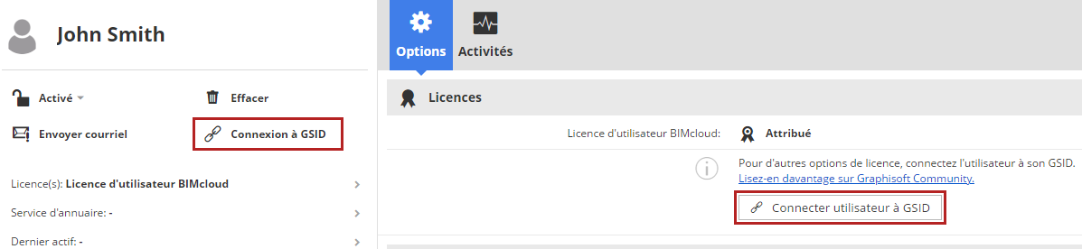 Utilisez cette méthode pour connecter un utilisateur de BIMcloud existant à son compte GSID. Ceci active des options de licence supplémentaires disponibles aux utilisateurs GSID seulement.