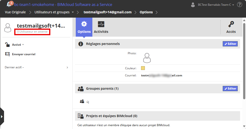Même pour les utilisateurs "en attente", l'administrateur de BIMcloud peut aller de l'avant et attribuer des autorisations, des appartenances à des groupes d'utilisateurs et d'autres paramètres - il n'est pas nécessaire d'attendre que l'invitation soit acceptée.