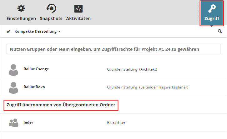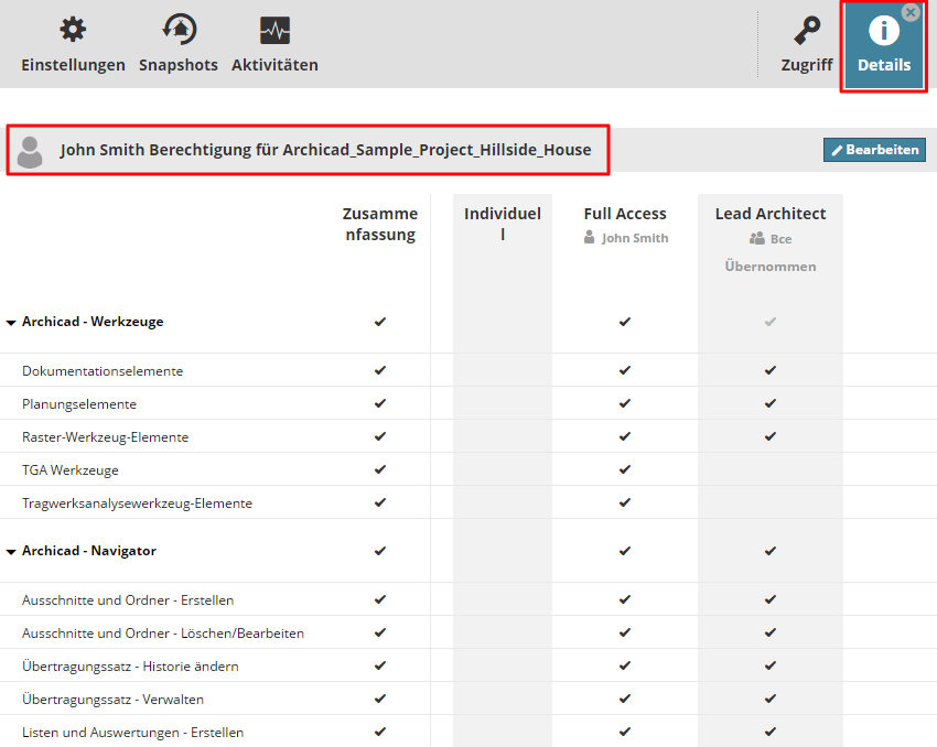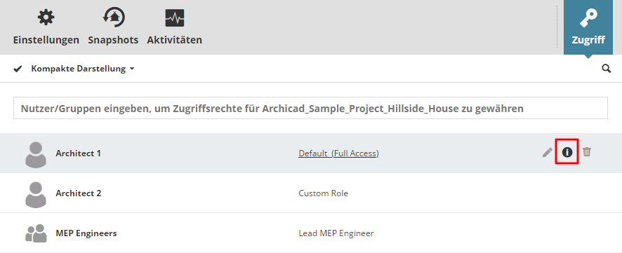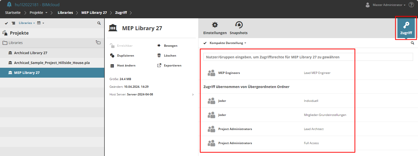Wählen Sie ein Element im BIMcloud Manager aus. Das Paneel "Zugriff" zeigt an, welche Nutzer oder Gruppen Zugriff auf dieses Element haben.