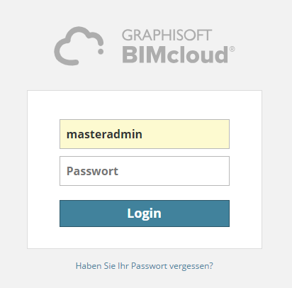 Der Anmeldename für den Master-Administrator lautet: masteradmin. Das Passwort wurde bei der Server-Installation im BIMcloud Manager Configurator festgelegt. Wenn Sie das Passwort vergessen haben, führen Sie den BIMcloud Manager Configurator erneut aus und legen Sie ein Passwort fest.