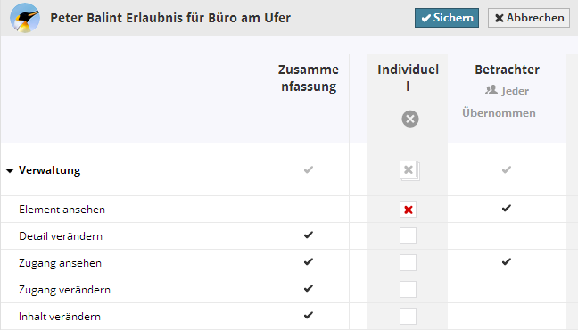 Auch wenn ein Zugriffsrecht einem Nutzer zu einem Inhaltselement auf einer höheren Ebene in der Hierarchie erteilt wurde, kann sie auf einer niedrigeren Ebene nur entzogen werden, indem dem Nutzer eine individuelle Rolle zugewiesen wird.
