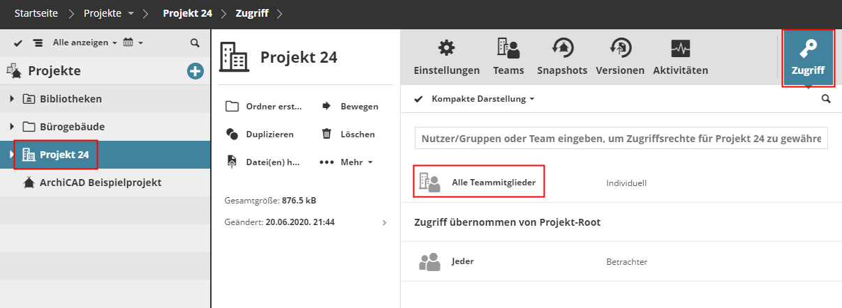 Definieren von Berechtigungen für Teams, die einem BIMcloud-Projekt zugewiesen sind