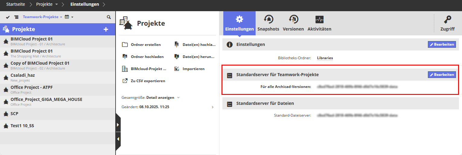 Wenn ein Nutzer ein Projekt aus Archicad freigibt und es in dem momentan ausgewählten BIMcloud-Ordner platziert, wird das Projekt automatisch von dem hier ausgewählten BIMcloud Server gehostet.