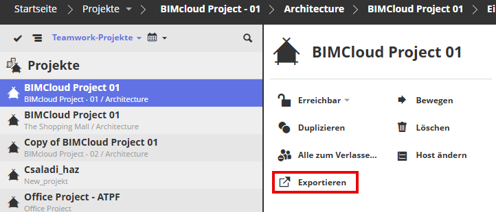 Mit dieser Funktion können Sie ein Teamwork-Projekt oder eine Bibliothek mit dem Dateiformat .BIMProject oder .BIMLibrary) auf Ihren Computer herunterzuladen.