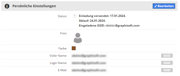 Der Einladungsstatus und das Ablaufdatum können in den Nutzer-Einstellungen angezeigt werden. Die Einladung verfällt automatisch nach 7 Tagen.